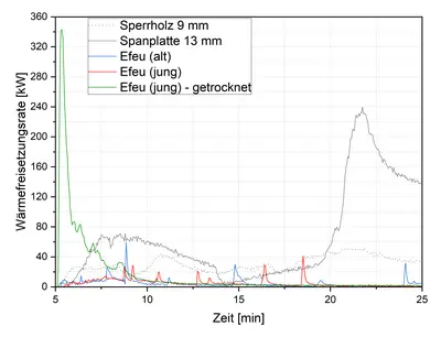 Wärmefreisetzungsrate eines 42 Tage getrockneten, eines vitalen jungen und eines vitalen alten Efeus im Vergleich zu einer 13 mm Span- und einer 9 mm Sperrholzplatte