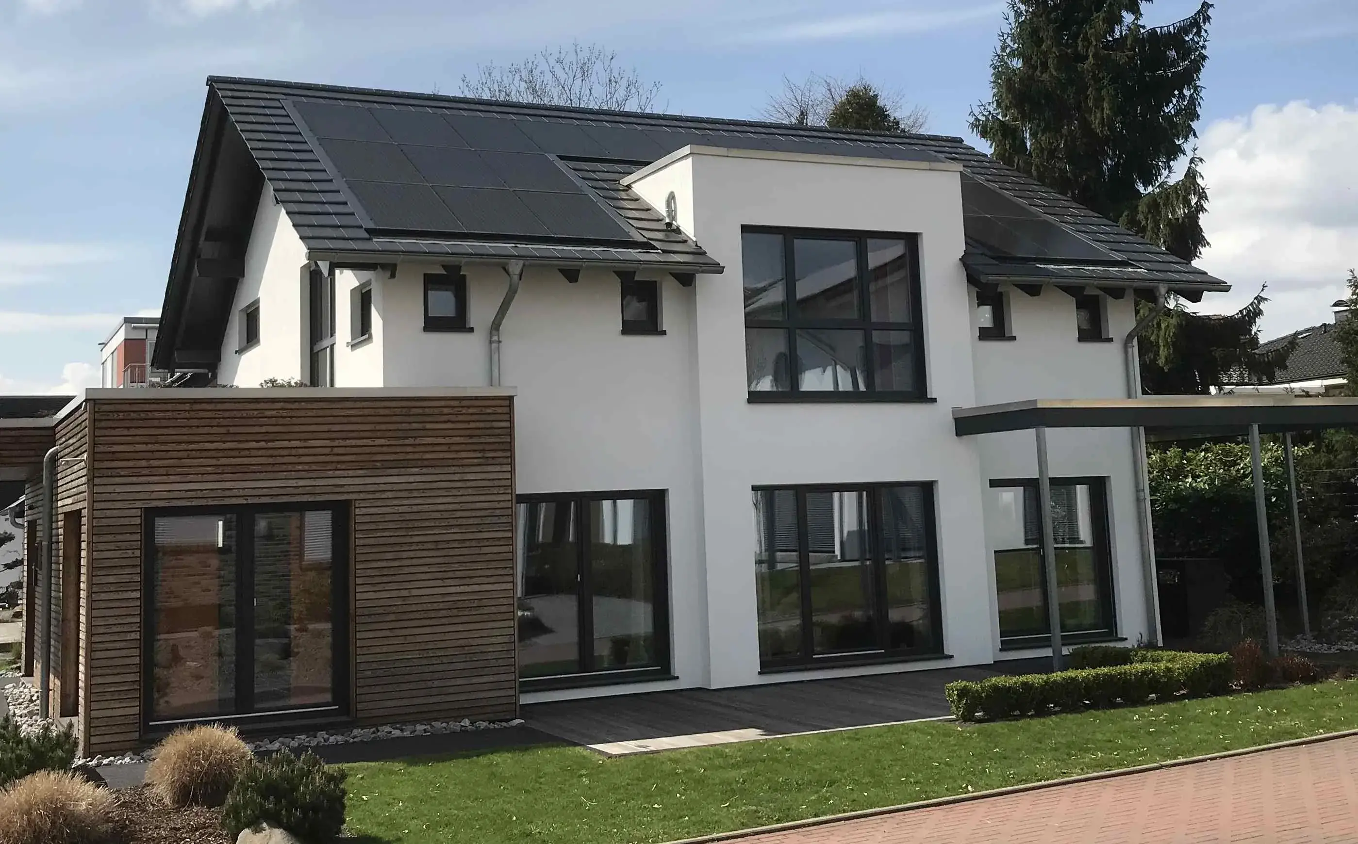 Das zweigeschossige Musterhaus R 140.20 befindet sich in der neu errichteten FertighausWelt in Wuppertal und wurde im Jahr 2013 errichtet. Die energiesparende Gebäudehülle bildet die Grundlage für ein Haus, das dank innovativer und regenerativer Haustechnik zum Effizienzhaus Plus wird. Auf dem Dach erzeugt die Photovoltaikanlage mehr Energie als für den Betrieb der modulierenden Wärmepumpe sowie für den Bedarf an Haushaltsstrom benötigt werden. Zusätzlich hilft eine kontrollierte Wohnraumlüftung mit Wärmerückgewinnung weitere Energie einzusparen und sorgt für ein gesundes Raumklima. Ein derzeit noch installiertes Windrad ist nicht in Betrieb. Der Stromüberschuss kann an einer E-Tankstelle für das Aufladen eines Elektro Autos genutzt werden.